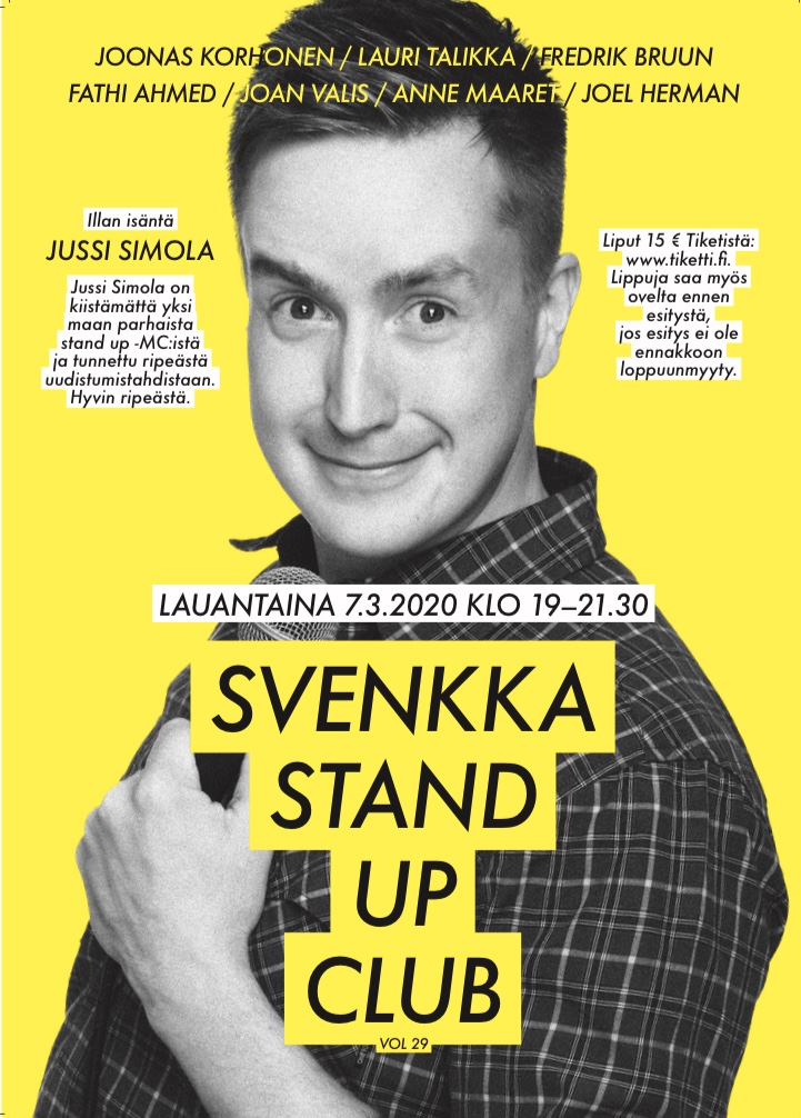 Jussi Simola, Fathi Ahmed, Joonas Korhonen, Lauri Talikka, Fredrik Bruun, Joan Valis, Anne Maaret ja Joel Herman — Svenkka Stand Up Club vol.29